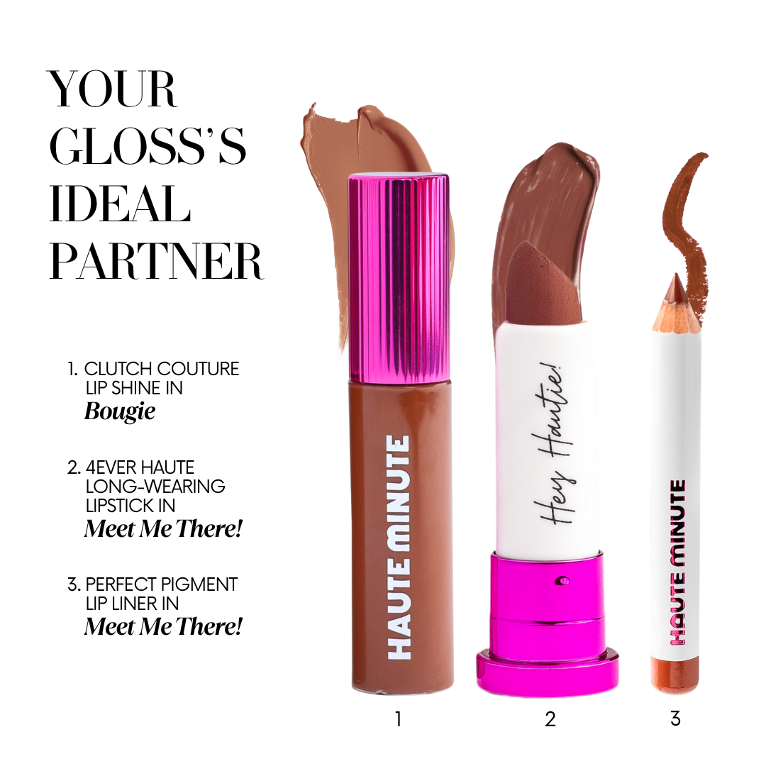 Introducing Clutch Couture Lip Shine in Bougie, the perfect neutral shade by Haute Minute Makeup. This clutch-sized lip shine features a glossy, lightweight finish that feels luxurious without being sticky, giving your lips a radiant glow.